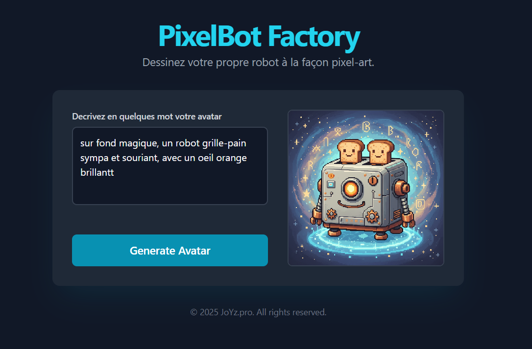 PixelBot-Favtory : Une usine à robots Un générateur de robot avatar au format pixel-art généré par IA. October 17, 2025 Actualités Lire